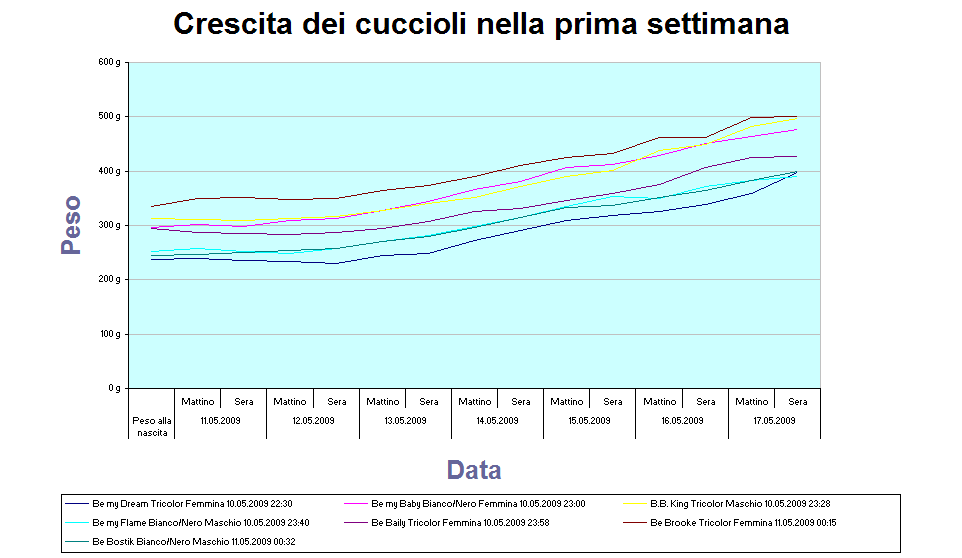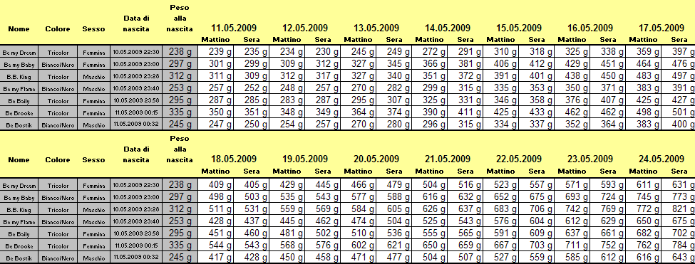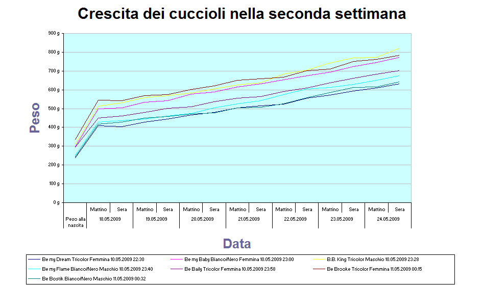 A due settimane, quasi tutti i cuccioli hanno aperto gli occhi, solo "Be my Dream" e "Be my Brooke" sono rimaste un pochino indietro. La crescita avviene regolare senza complicazioni, allŽinizio della settimana era sorta la preoccupazione che il latte non fosse sufficiente, ma si trattava di un allarme infondato. Connie, quando lo fa, si occupa di loro con attenzione e grande istinto materno, purtroppo spesso preferisce svignarsela, poi dobbiamo sempre ribadirgli che deve allattare e lei non é tanto convinta! I cuccioli iniziano a giocare tra di loro, cominciano a fare le prime esperienze, gli altri cani in casa sono del tutto indifferenti, sembra quasi che non li riguardi, ma non sanno che tra poco si comincia con la baraonda!!!
