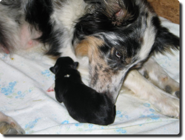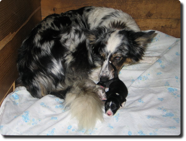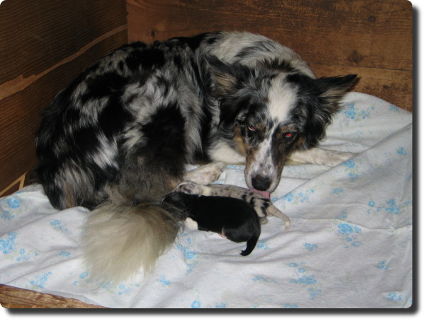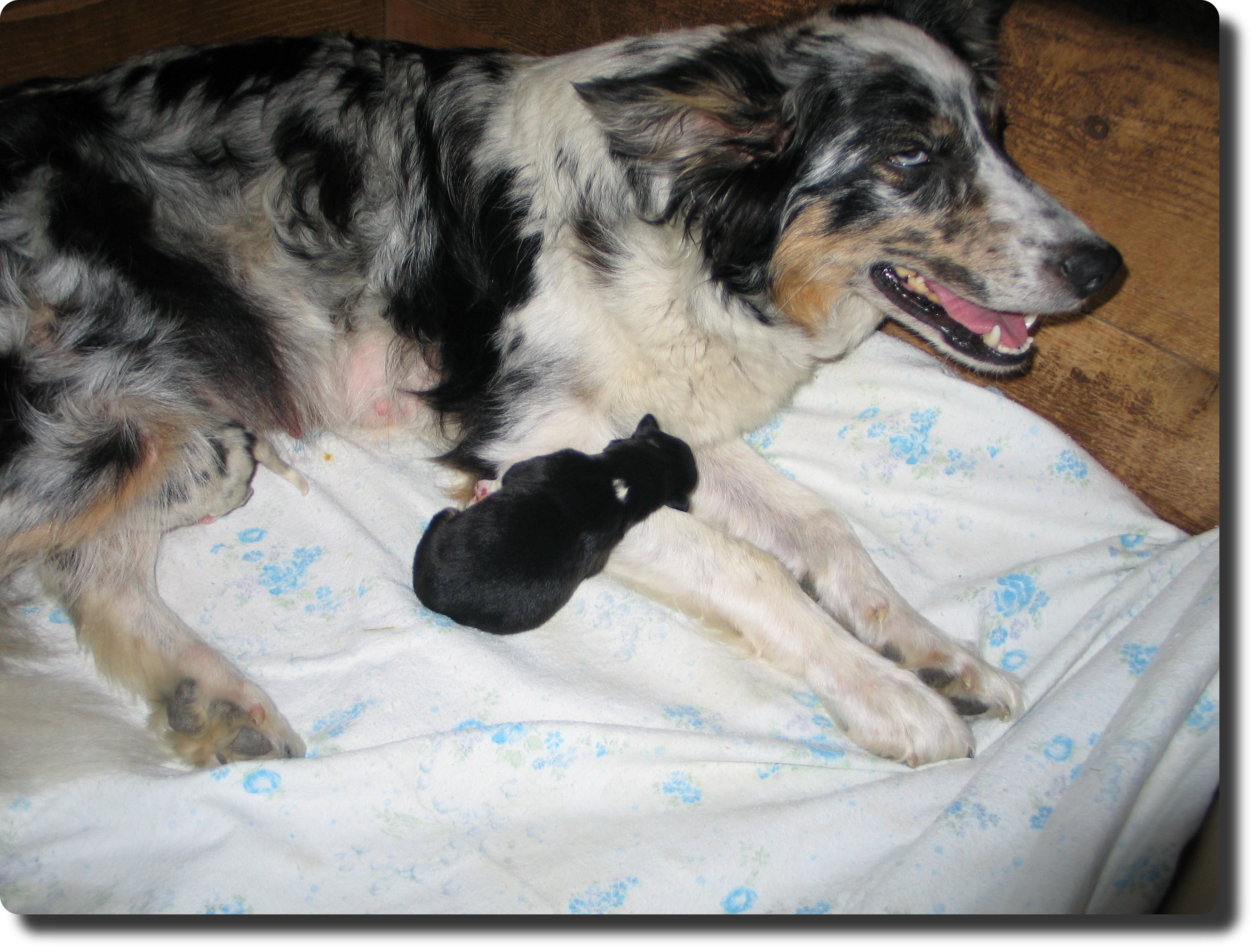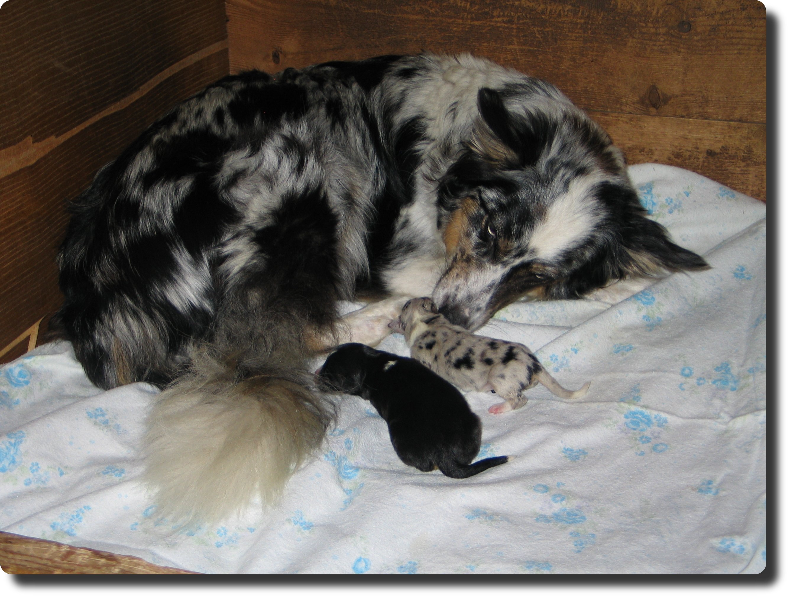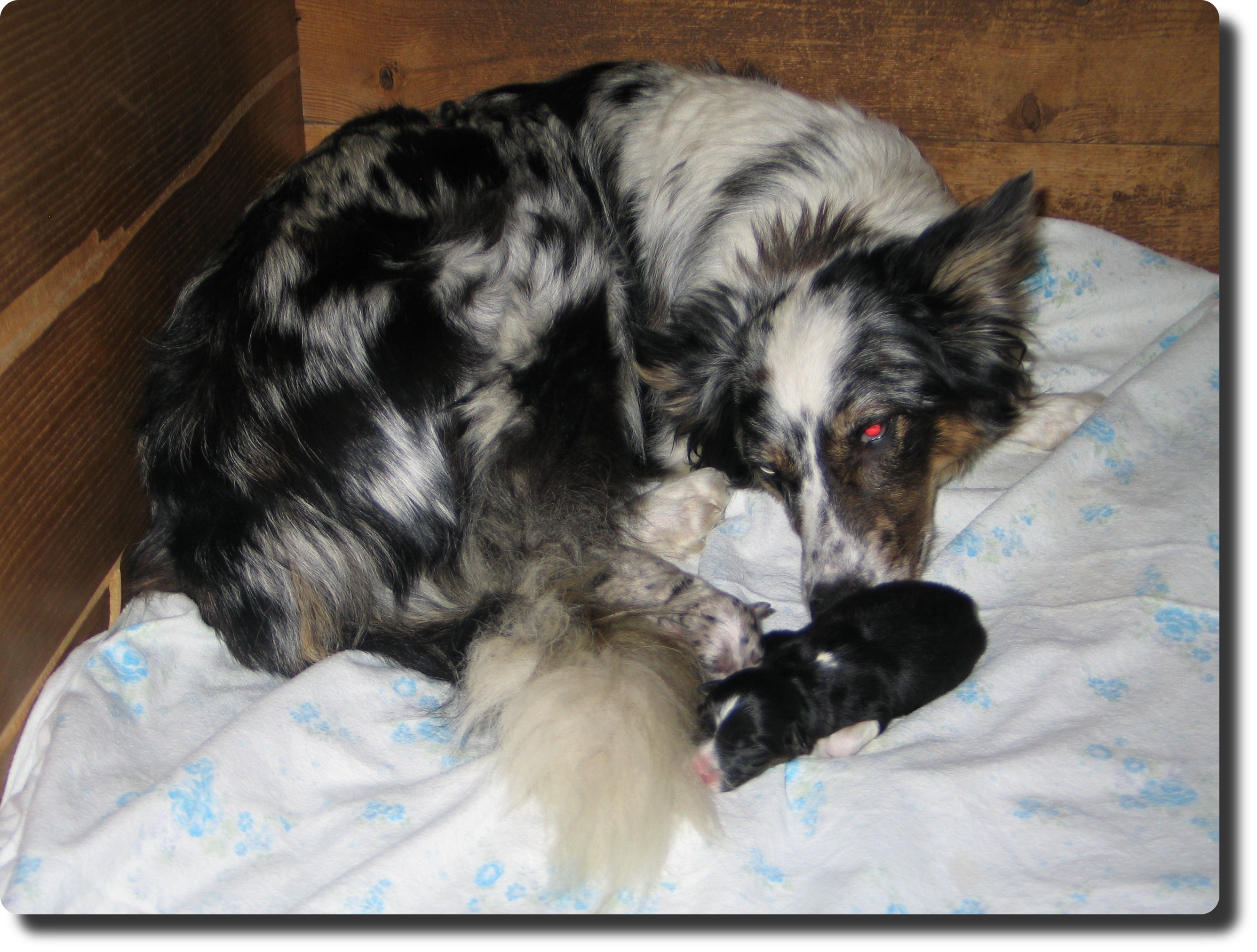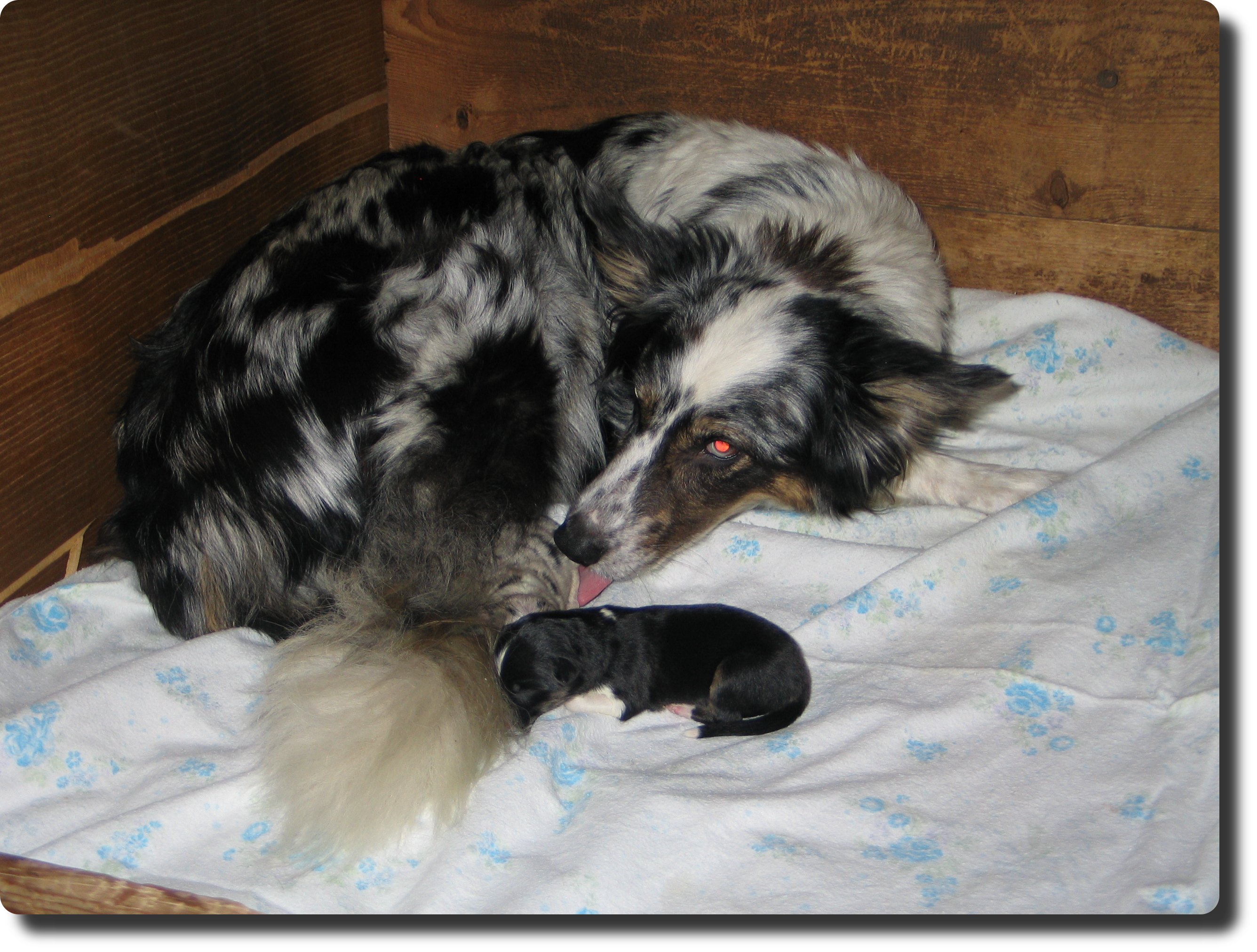 In laufe des Tages hat Sandy vier Welpen zur Welt gebracht ! Zwei davon haben es leider nicht geschafft. Die anderen zwei sind wohl auf, Alina eine blue-merle Hündin und Ash ein tricolor Rüde. Im moment schlafen und essen sie nur, Sandy ist eine tolle Mammi.