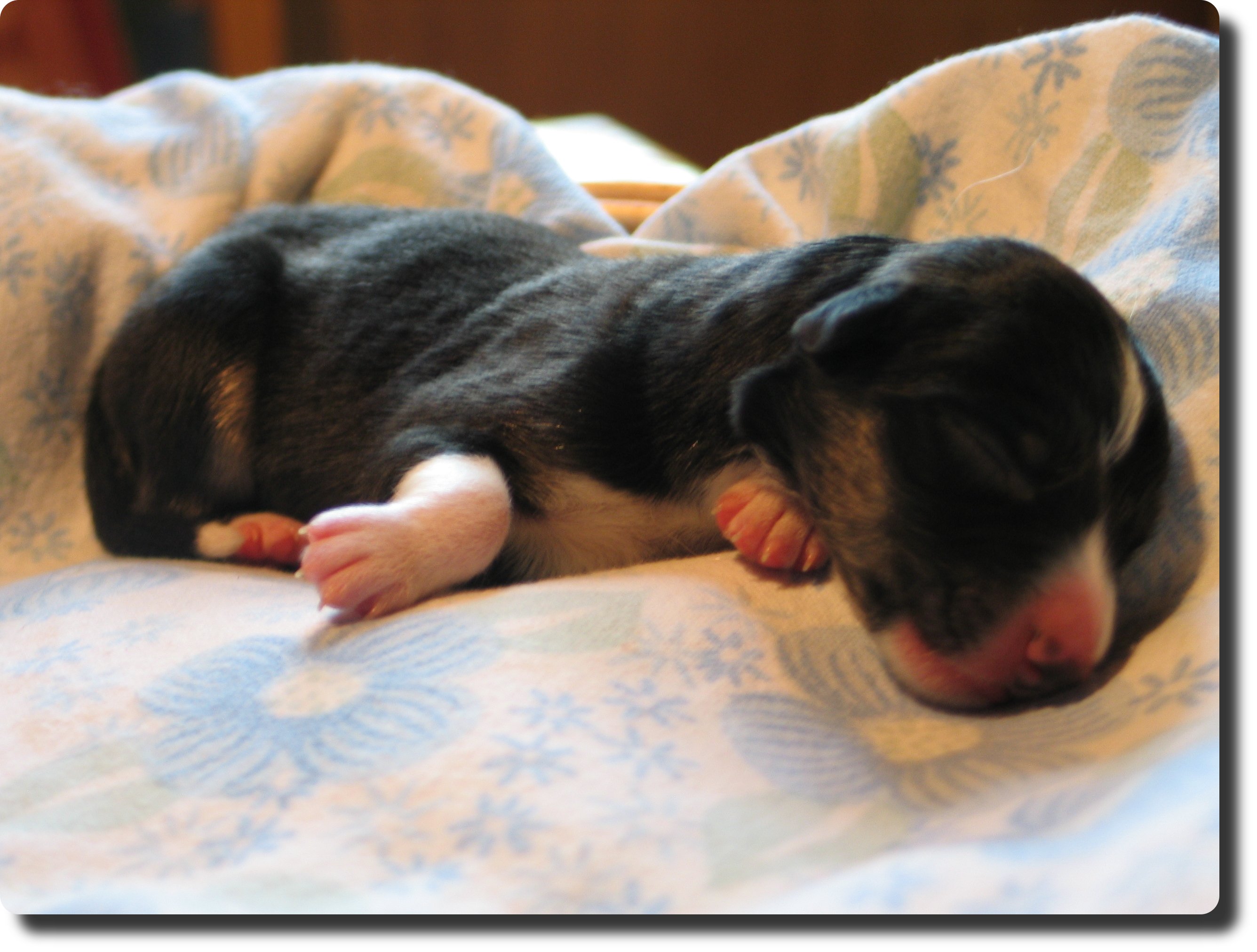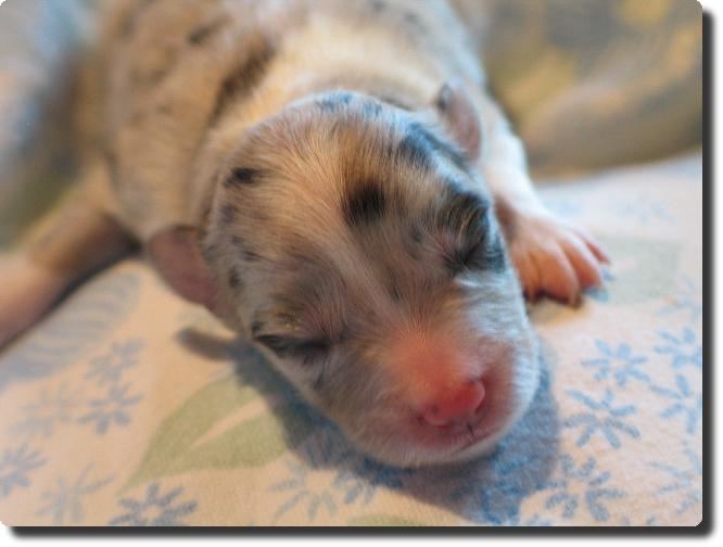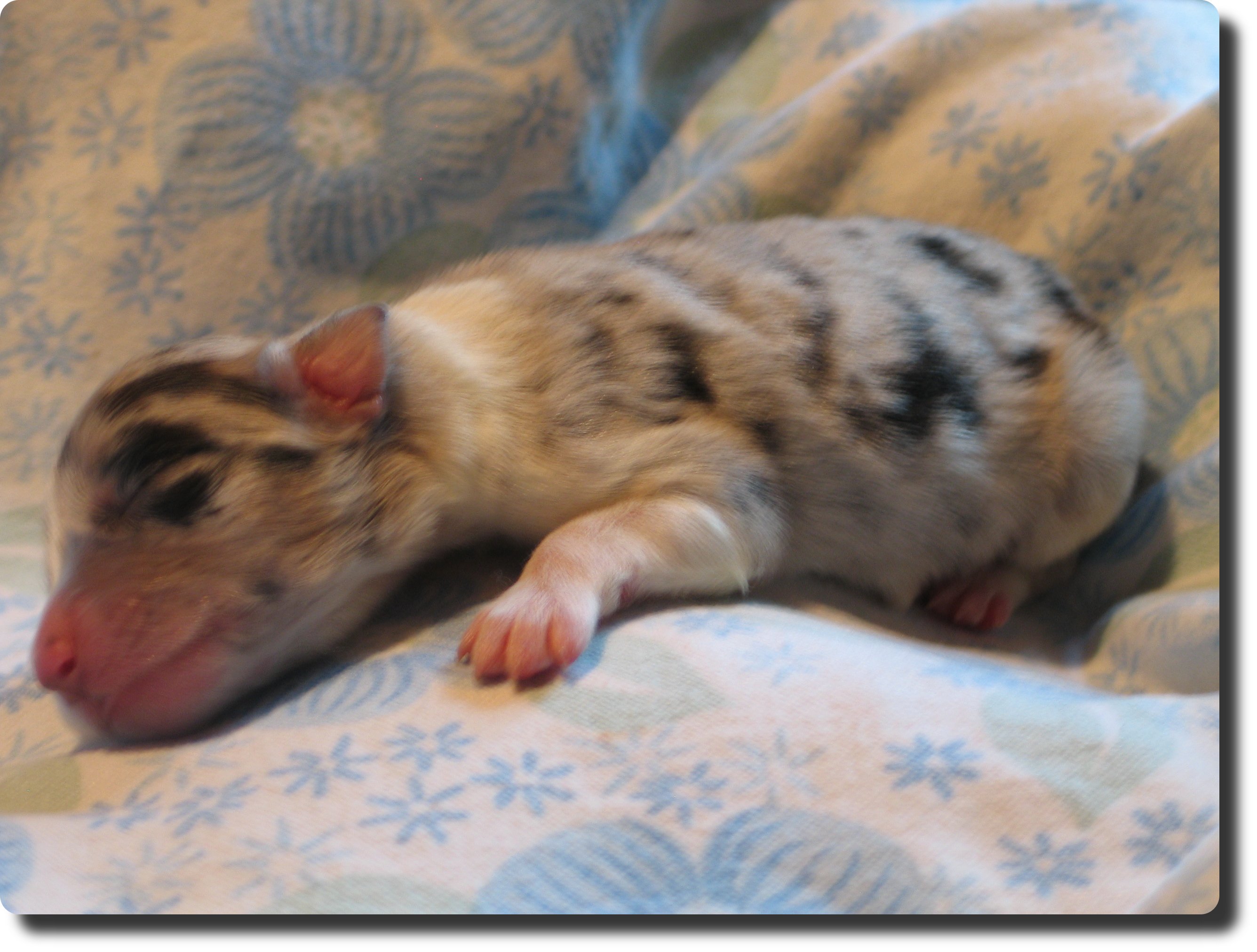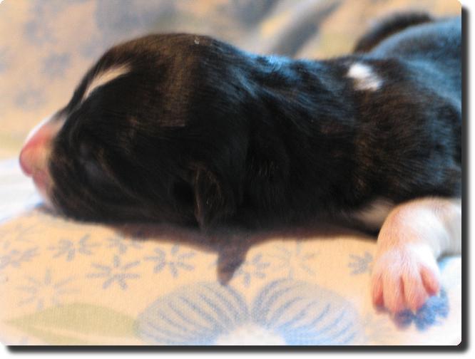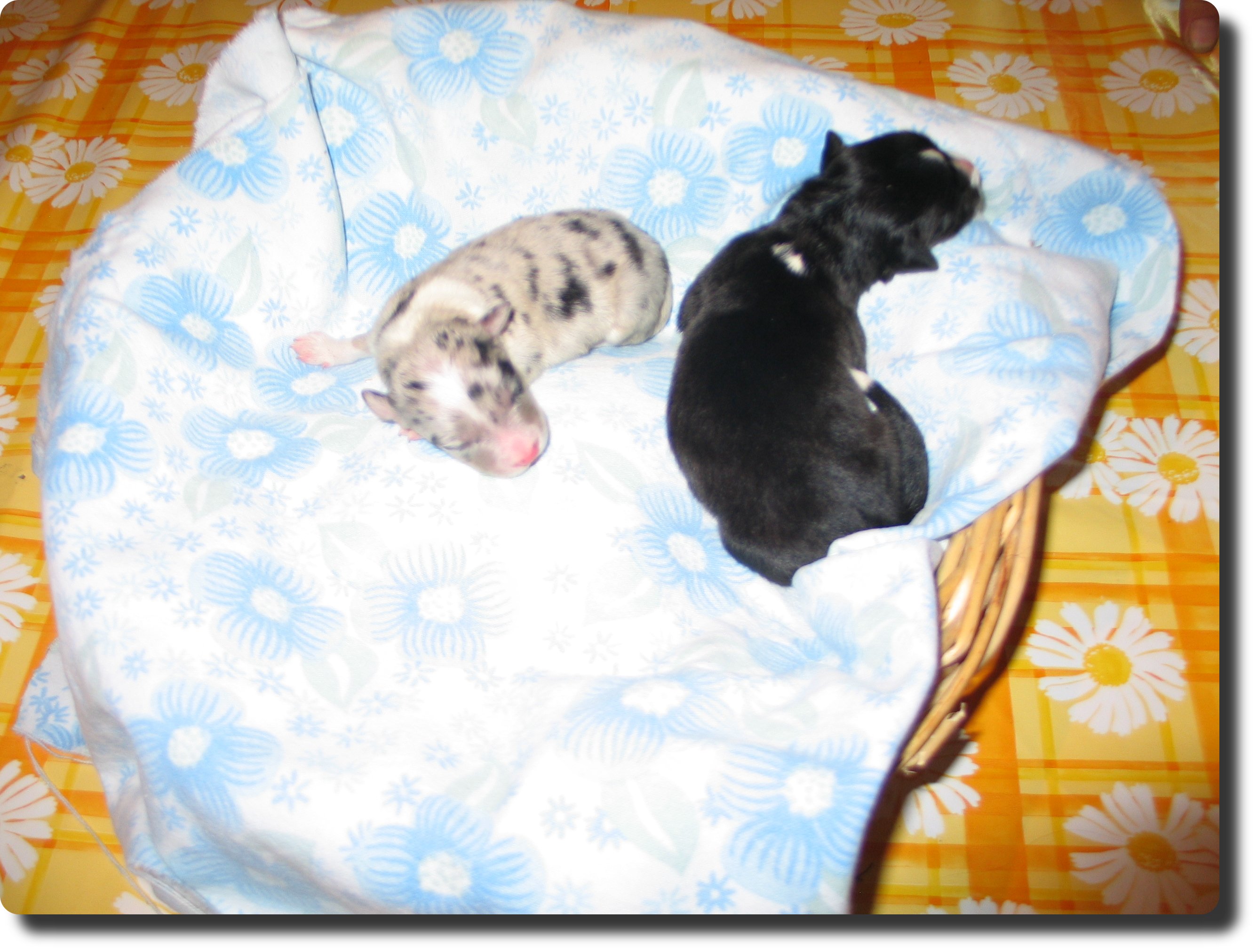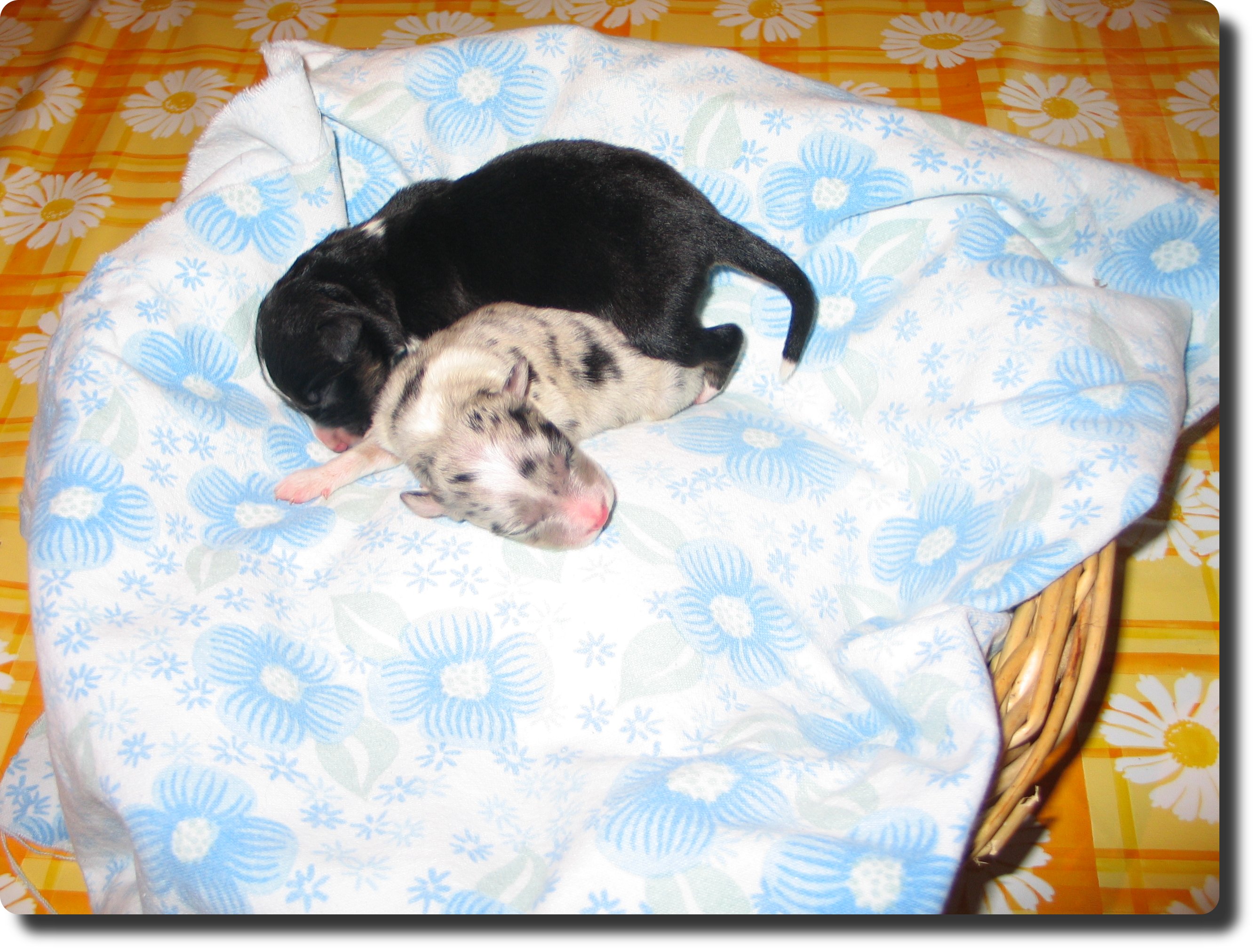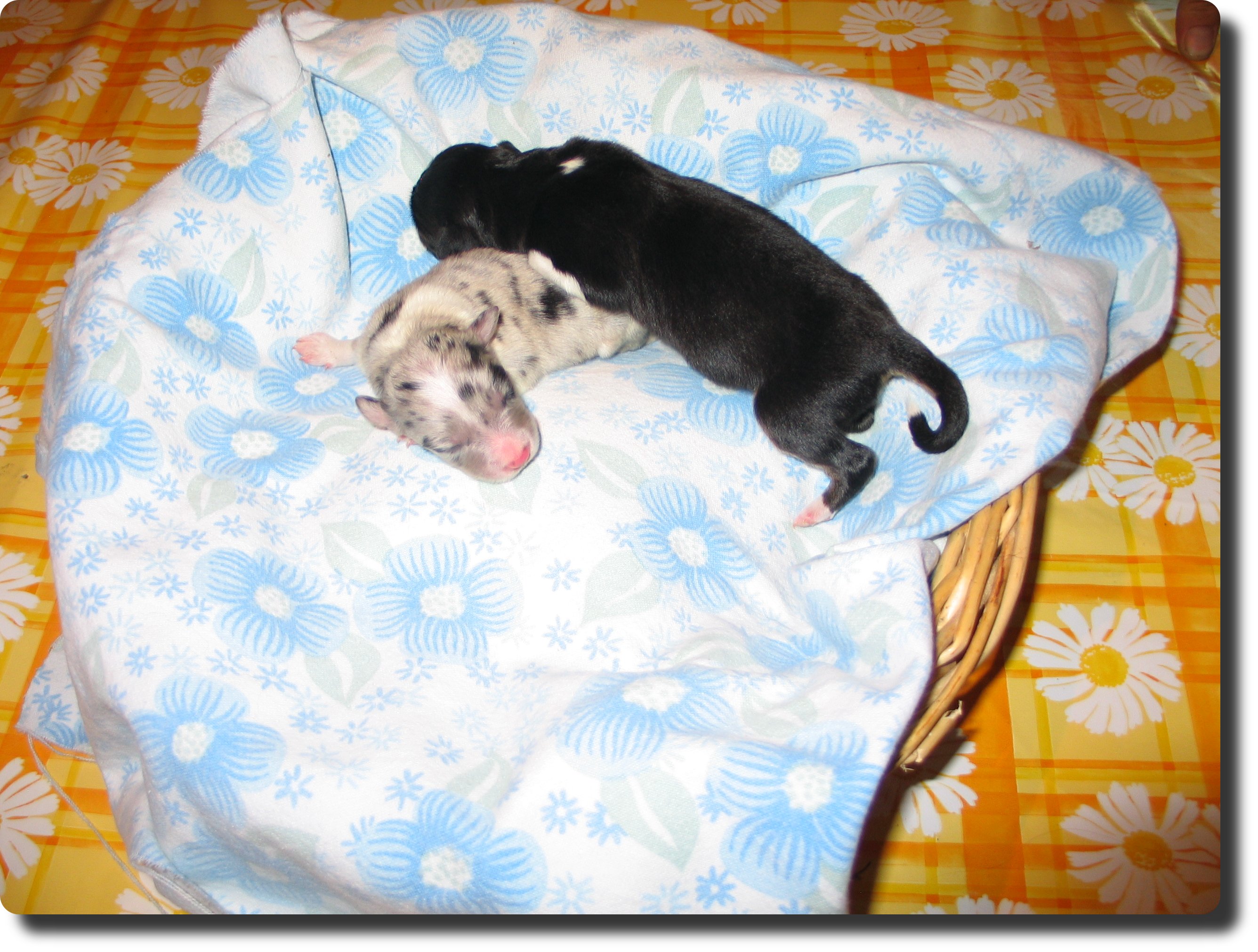 In laufe des Tages hat Sandy vier Welpen zur Welt gebracht ! Zwei davon haben es leider nicht geschafft. Die anderen zwei sind wohl auf, Alina eine blue-merle Hündin und Ash ein tricolor Rüde. Im moment schlafen und essen sie nur, Sandy ist eine tolle Mammi.