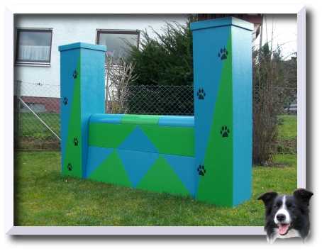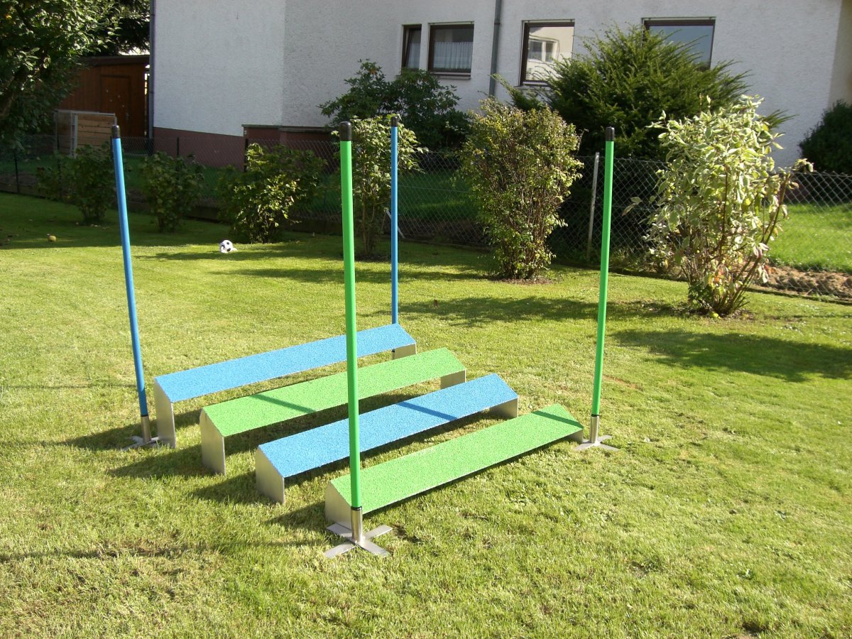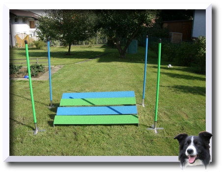 Palizzata per Agility regolamentare secondo F.C.I., struttura in alluminio fondo in compensato marino con bacchette trasversali, ricoperto di gomma granulata EPDM (spessore 6-8 mm), resistenza alle infiltrazioni dell’acqua garantita dall’applicazione di gomma sigillante in tutte le superfici d’appoggio; regolazione angolo di apertura con catena e moschettoni.