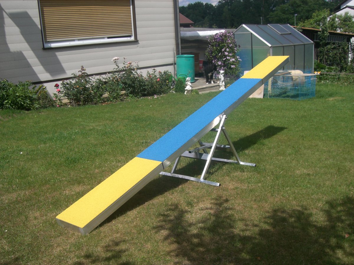 Bascula per Agility regolamentare secondo F.C.I. , struttura in alluminio fondo in compensato marino con bacchette trasversali, ricoperto di gomma granulata EPDM (spessore 6-8 mm), resistenza alle infiltrazioni dell’acqua garantita dalla applicazione di gomma sigillante in tutte le superfici d’appoggio; regolazione a tre stadi dell’altezza con chiavistello (funzione utile per l’addestramento).