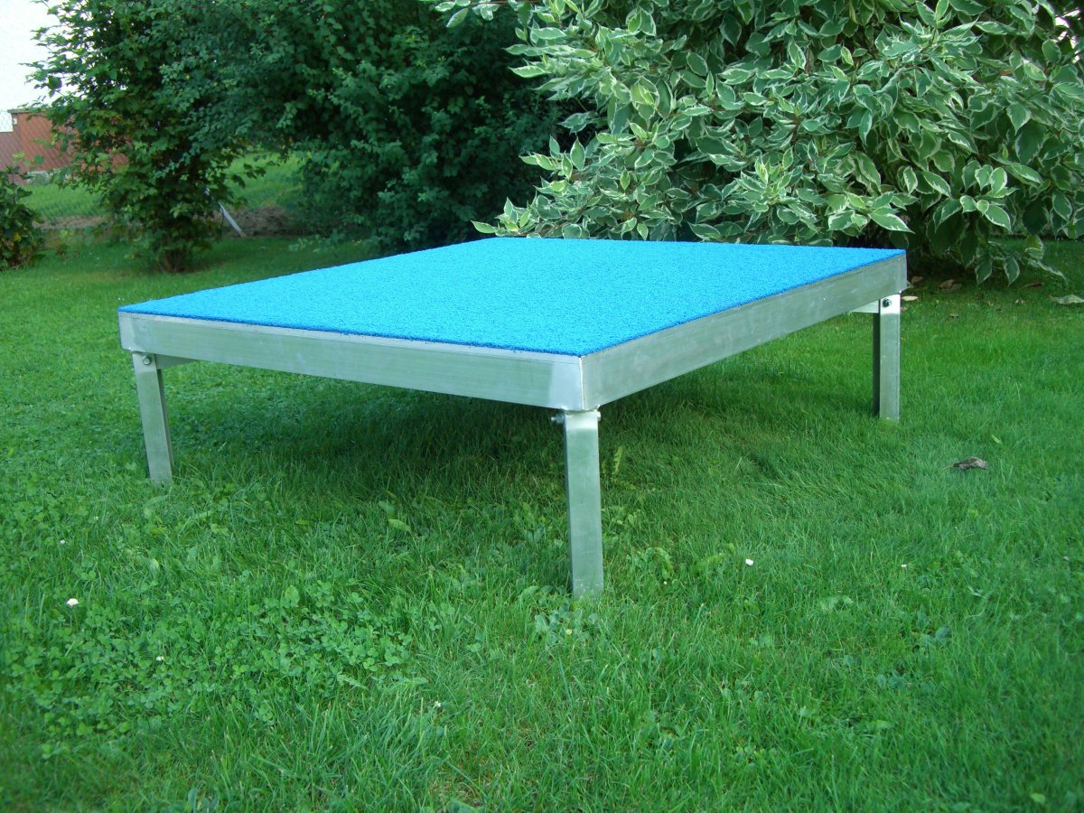 Tavolo per Agility regolamentare secondo F.C.I. , struttura in alluminio fondo in compensato marino, ricoperto di gomma granulata EPDM (spessore 6-8 mm), resistenza alle infiltrazioni dell’acqua garantita dalla applicazione di gomma sigillante in tutte le superfici d’appoggio; regolazione a due stadi dell’altezza (small/medium, large) con chiavistello di bloccaggio delle gambe ripiegate.